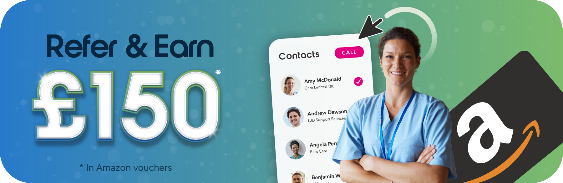 When you recommend us to another care provider and they sign up, we’ll say thank you with an Amazon gift card worth £150.